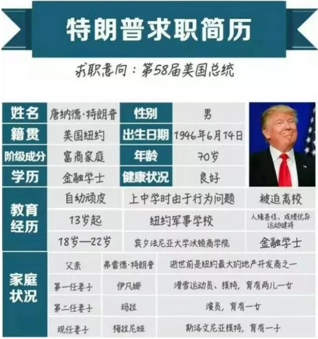 (1)70歲的唐納德特朗普將擔任美國第58屆總統(tǒng)!令人不可思議的事是,特朗普的身份是一位“政治白丁”,22歲拿到金融學士學位,就職于父親的房地產(chǎn)公司,憑借自己的新穎策略,先后改造、修建幾座豪華酒店,成為金字塔頂端人士。